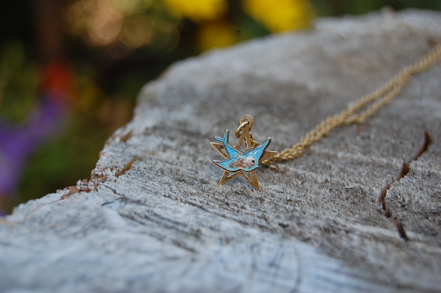 As you can see from the picture mine was well-loved. The enamel in the middle of the blue bird has chipped off. As an enamelist now I could try to fill in the chip myself, but I don’t think I would ever do that. I love the fact that the necklace shows it’s beautiful imperfections. Imperfections which are there because it’s been part of my beautifully imperfect life for such a long time.