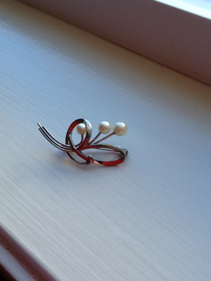 My Mom read the last post I did on her silver and pearl brooch and she sent me a message with a picture of another brooch. It turns out that the one I found in that little leather case is not the one I remember looking at when I was a kid. She bought that one at our local thrift store just a few years ago, but it is very similar to the one that I remember seeing. She took this photo with her Ipad of the old one for me…